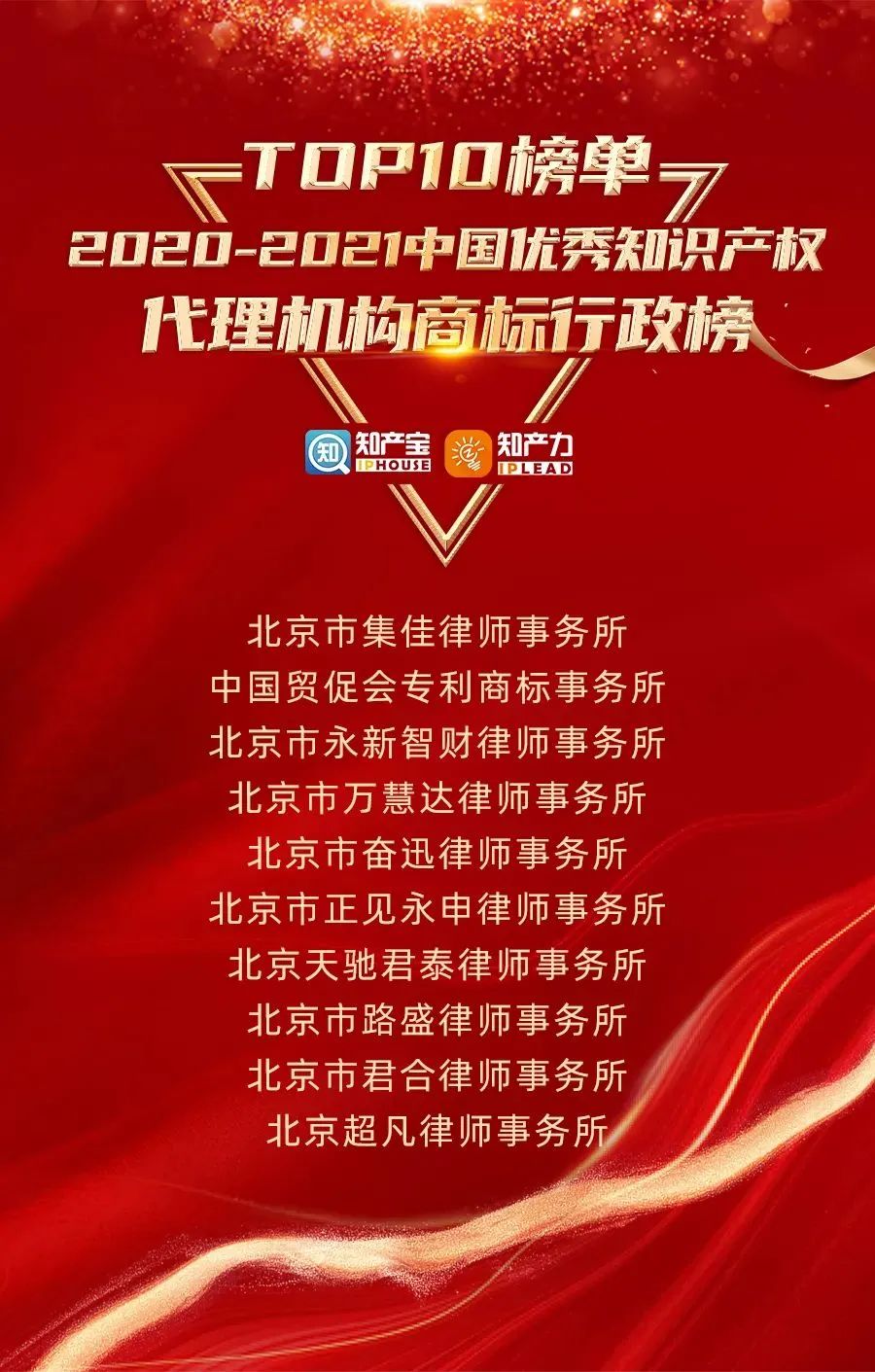 近日,备受业界关注的“2020-2021中国优秀知识产权代理机构榜”正式揭晓,B体育凭借长期以来在知识产权领域的卓越业绩和处理疑难案件的突出能力,从400余家知识产权代理机构中脱颖而出,荣登“中国优秀知识产权代理机构商标行政榜TOP10”。