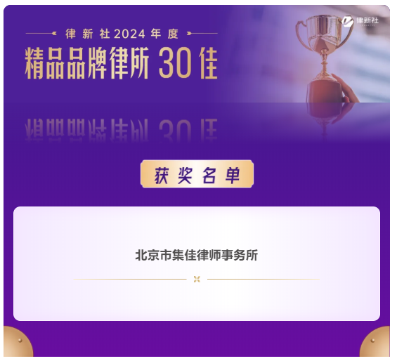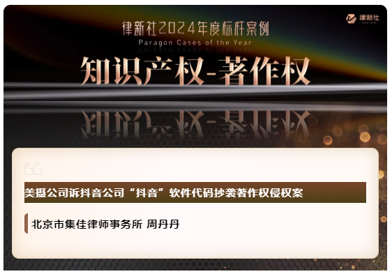 B体育凭借在知识产权保护领域卓越的专业实力与良好的行业口碑,入选《律所卓越品牌影响力指南(2024)》,荣获“律新社2024年度精品品牌律所30佳”奖项;同时,集佳周丹丹律师代理的“美摄公司诉抖音公司'抖音'软件代码抄袭著作权侵权案”获评“律新社2024年度标杆案例:知识产权-著作权领域”。
