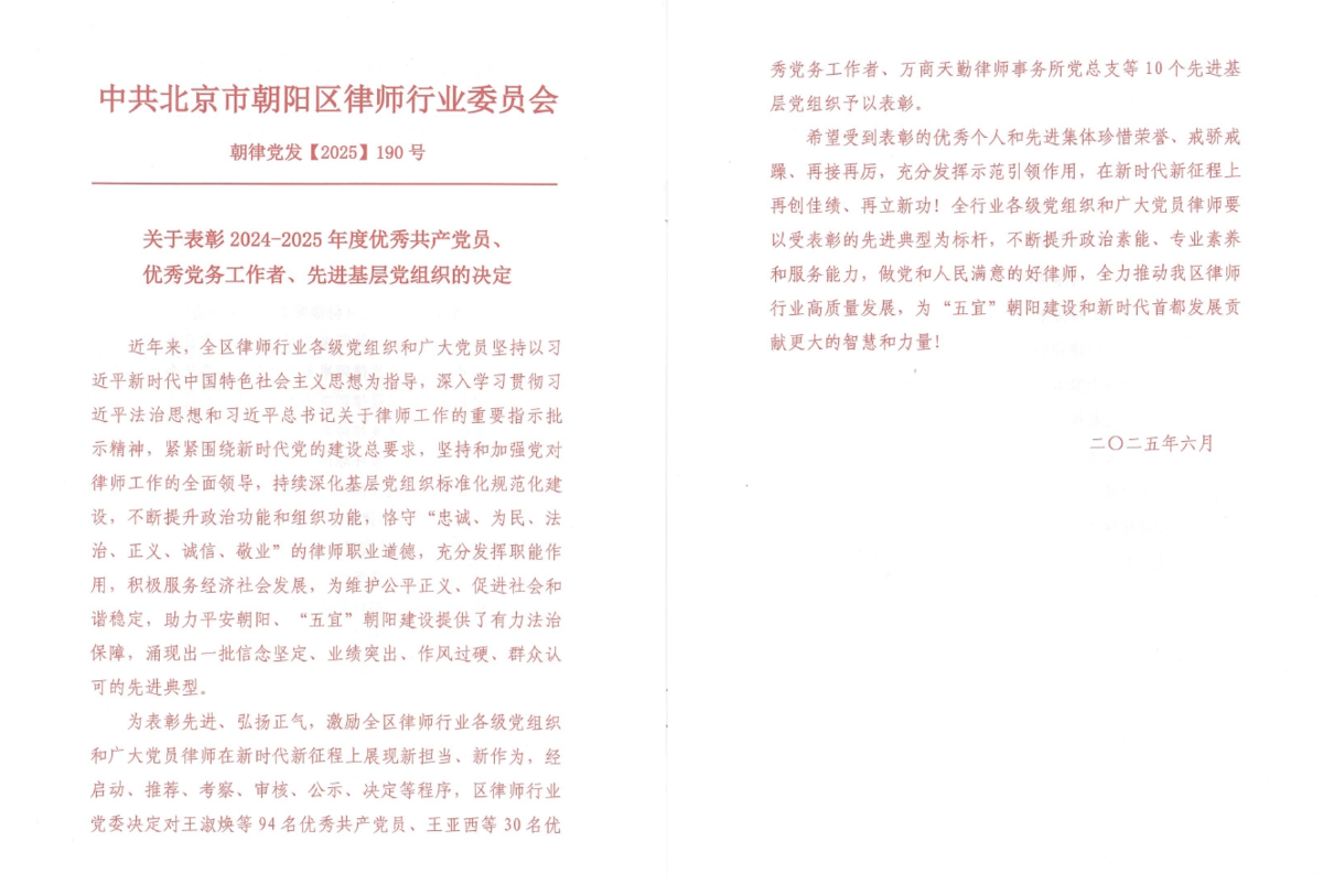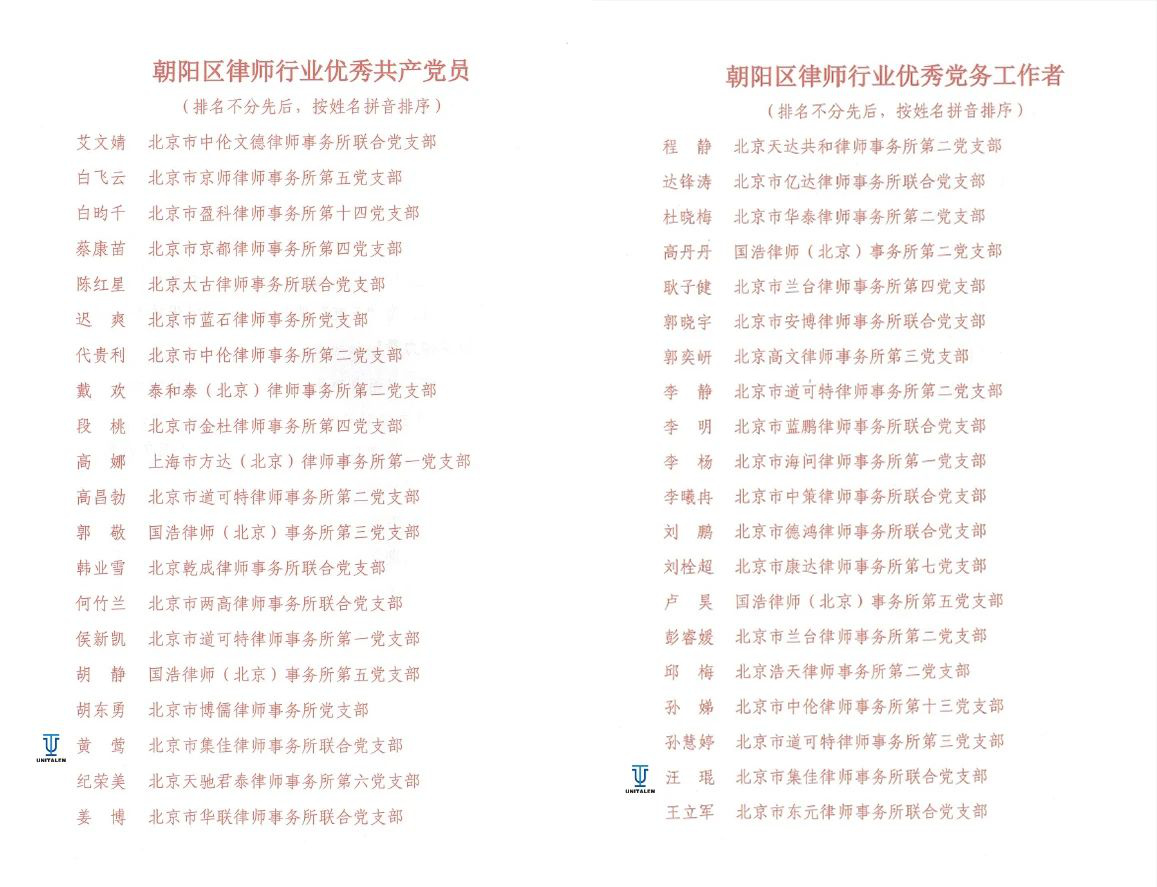 6月27日,朝阳区律师行业党委召开了朝阳区律师行业庆祝中国共产党成立104周年暨总结表彰大会,B体育联合党支部党员黄莺荣获“朝阳区律师行业优秀共产党员”称号,支部党员汪琨荣获“朝阳区律师行业优秀党务工作者”称号。